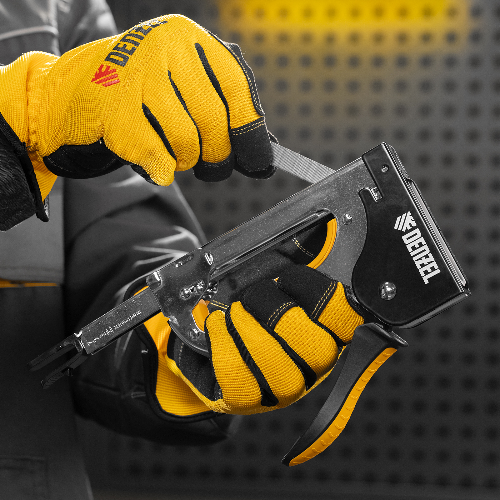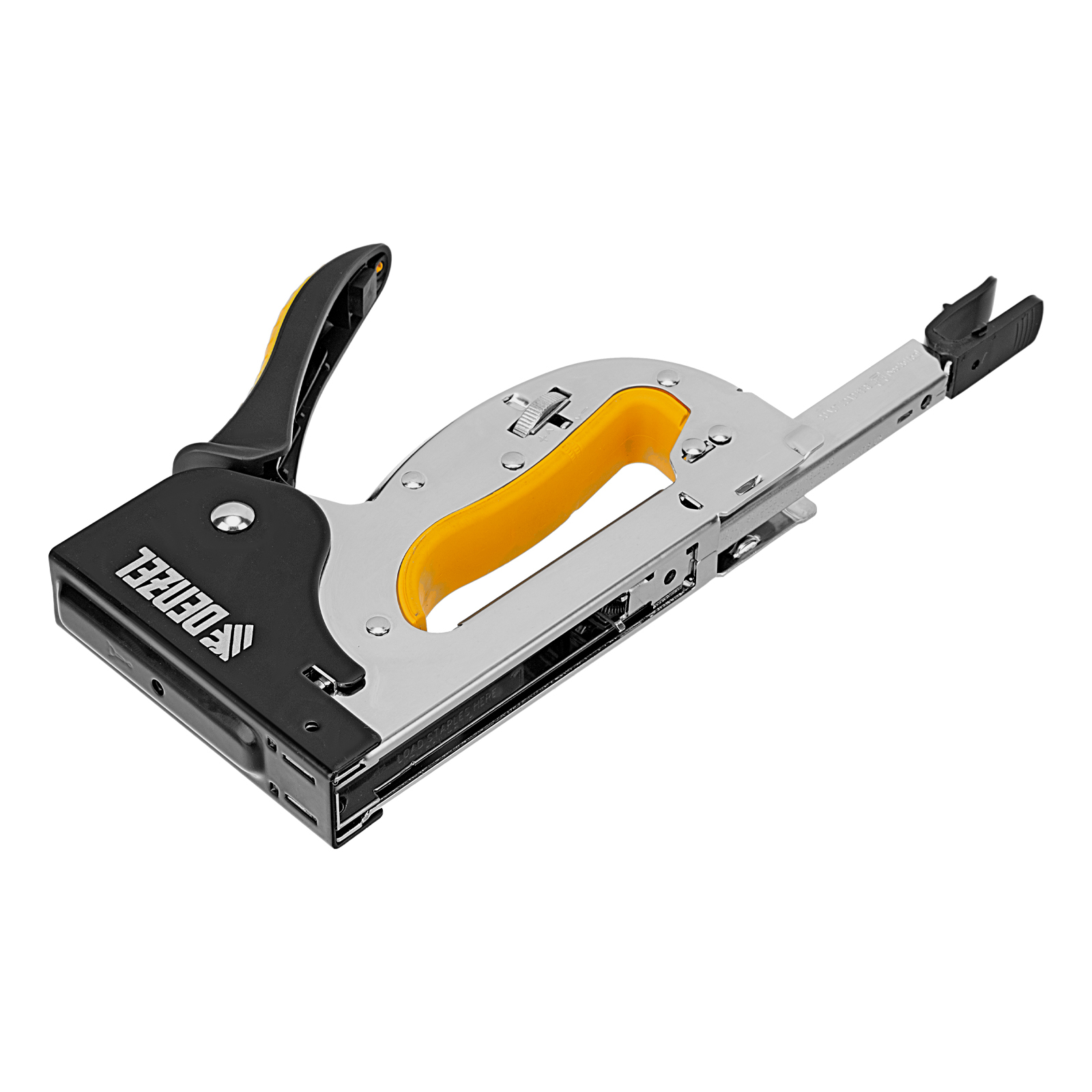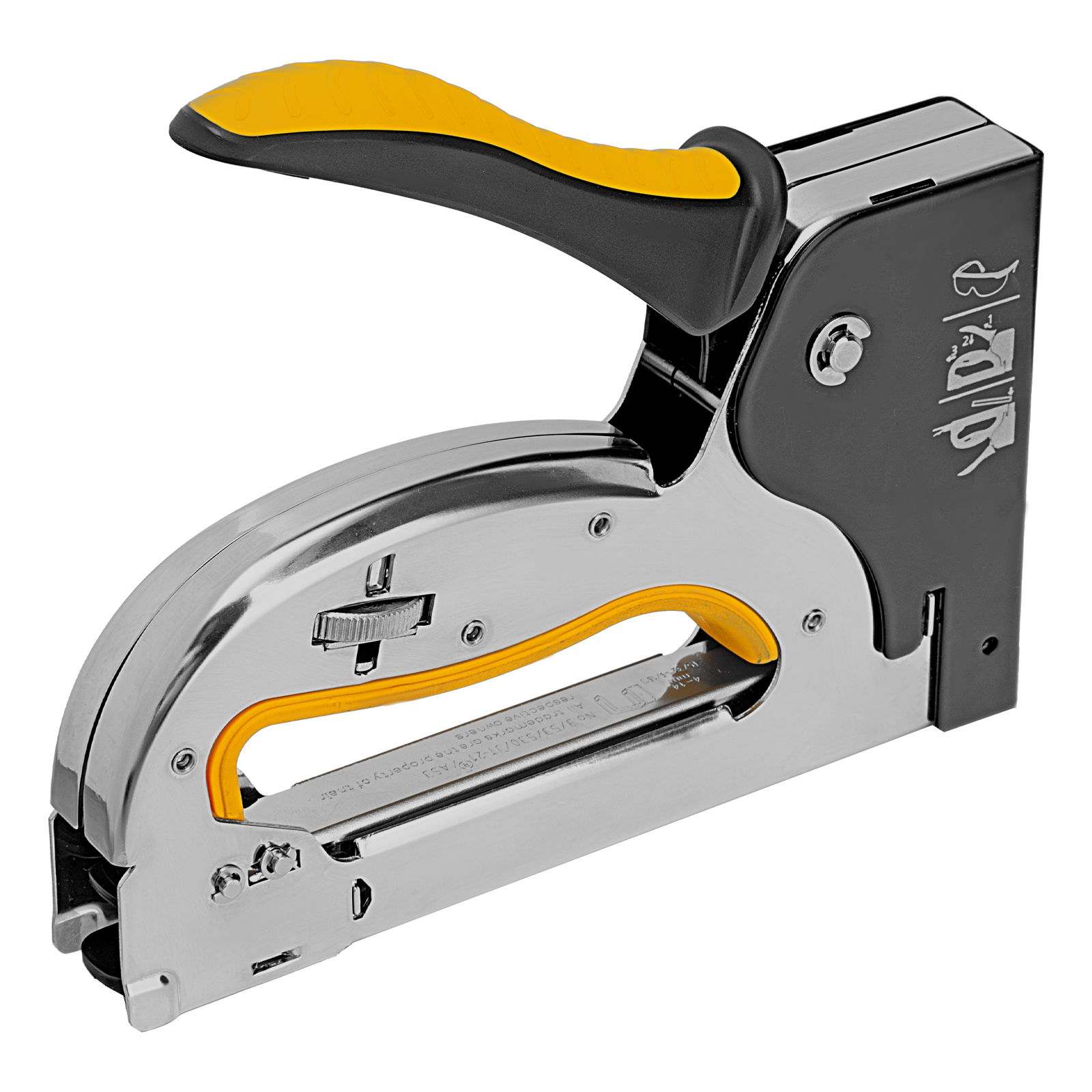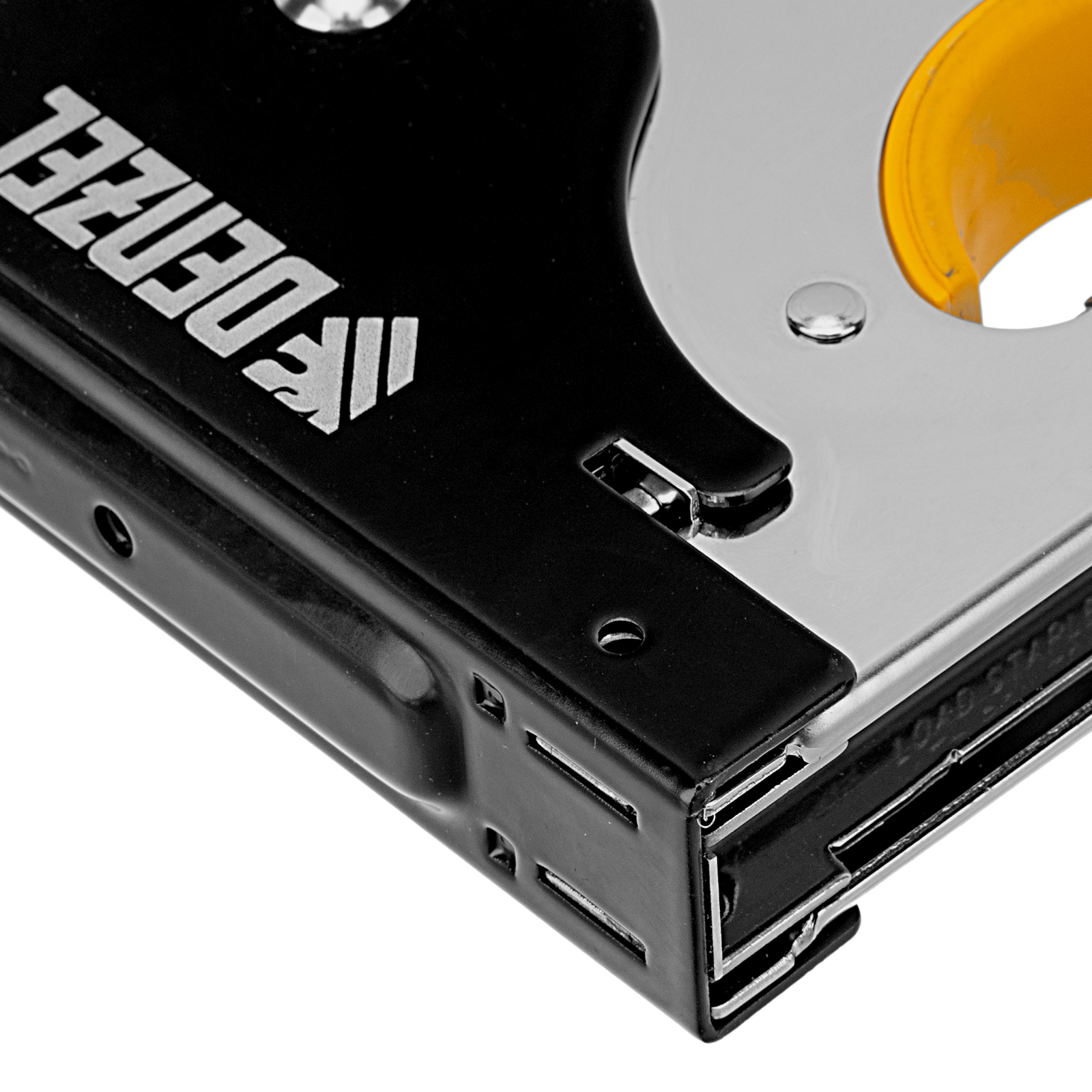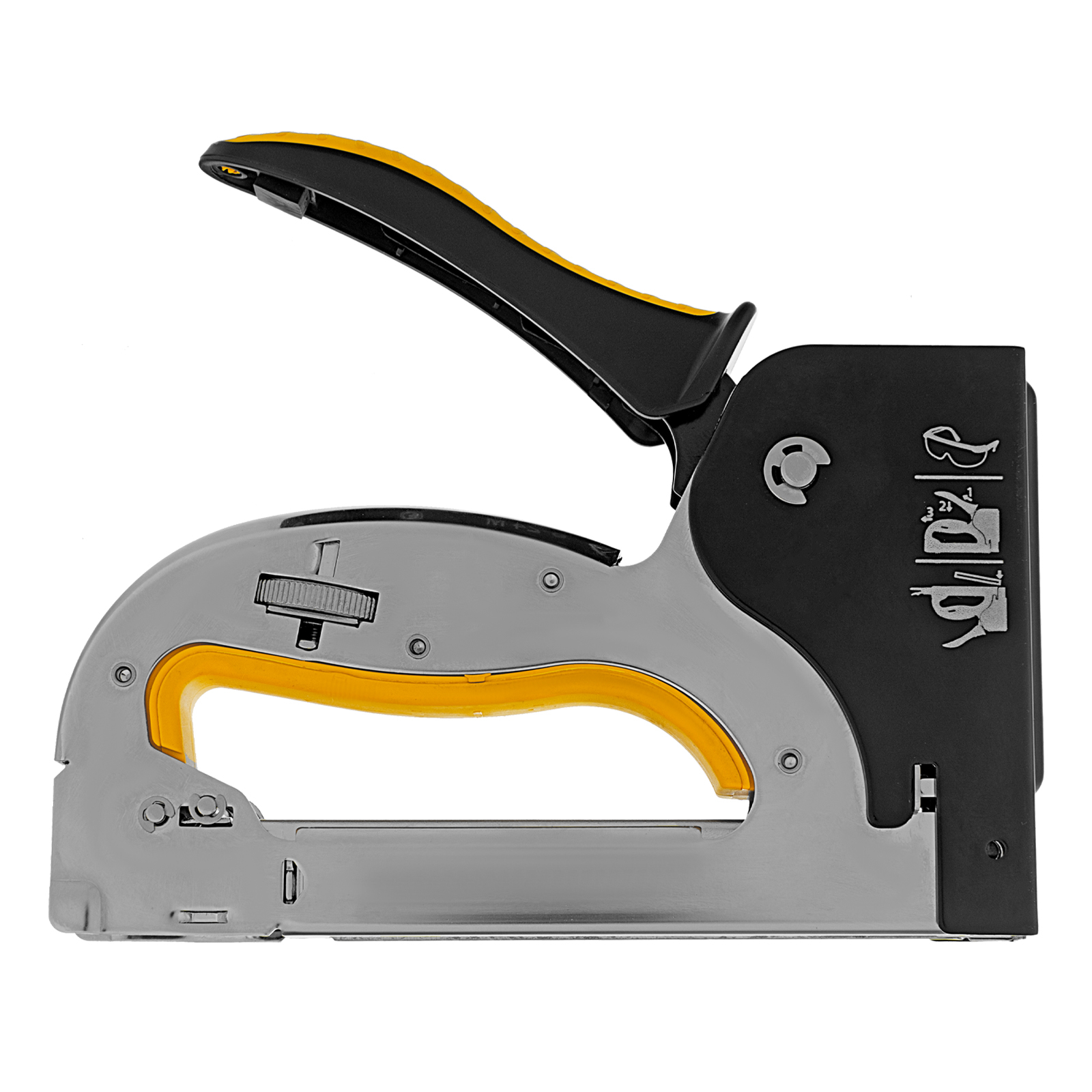 Металлический степлер Denzel 40223 с функцией плавной регулировки удара и двухкомпонентной рукояткой применяется для быстрого скрепления с деревянными основаниями листов фанеры, оргалита, ДСП, ДВП, картона или изоляционных материалов с помощью скоб типа 53 размером 4-14 мм. Инструмент подходит для частого использования, т. к. ударный механизм рессорного типа снижает усталость при длительной эксплуатации. Степлер пригодится во время сборки и обивки мебели, а также для проведения ремонтных работ.