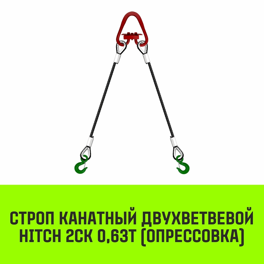 2 СК Опрессовка – грузоподъемное оборудование из двух соединенных стальных канатов с сердечником. Ветви стропа фиксируются овальным или треугольным звеном. Конструкция имеет чалочный крюк КЧ1 с одной стороны и коуш с петлей – с другой. Концы тросов опрессованы алюминиевыми втулками.