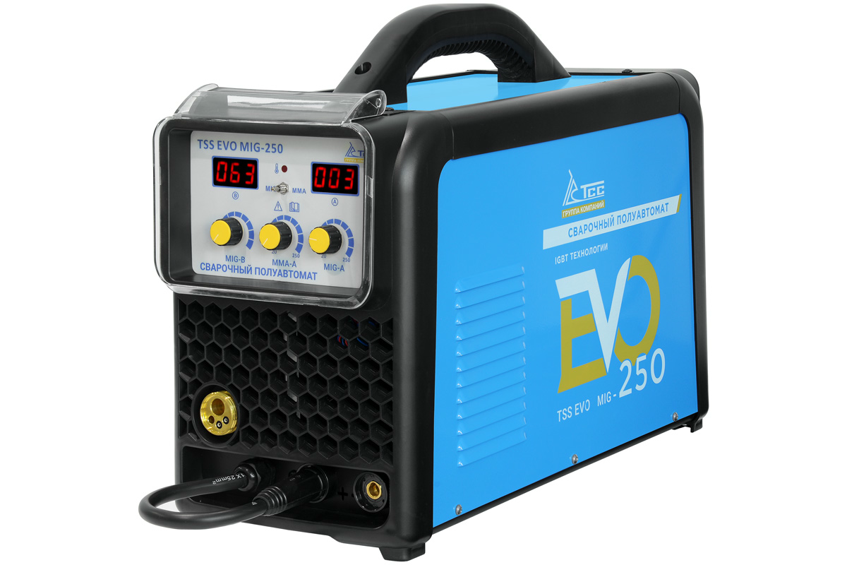 TSS EVO MIG-250 - Сварочный полуавтомат инверторный. Компактный, легкий, удобный для переноски, а также при транспортировке, хранении. Корпус из листовой стали, надежно защищает внутренние элементы от повреждения. Предназначен для полуавтоматической сварки в среде защитных газов (MIG/MAG), а также ручной дуговой сварки покрытым электродом (ММА). Аппарат имеет защиту от перегрузки, индикатор перегрева и неисправности, обеспечивая высокий уровень безопасности и надежность устройства. Так же данный аппарат имеет защиту от скачков напряжения. Высокое напряжение холостого хода обеспечивает легкость поджига сварочной дуги. Высокая стабильность сварки в реальном времени, простое интуитивно понятное управление сварочными параметрами.
