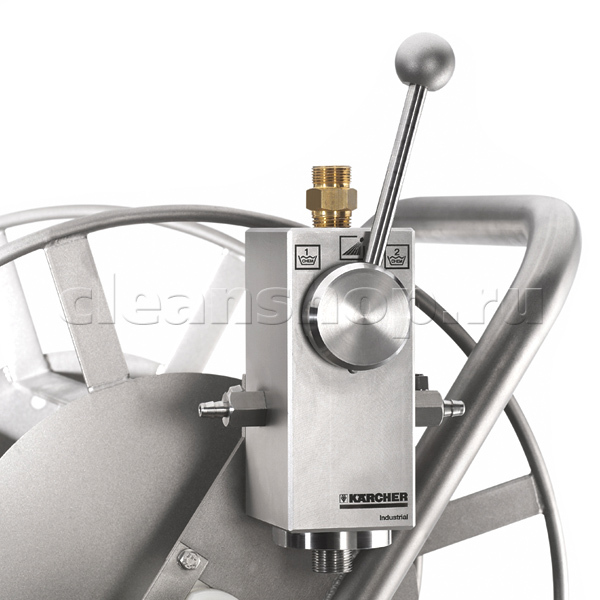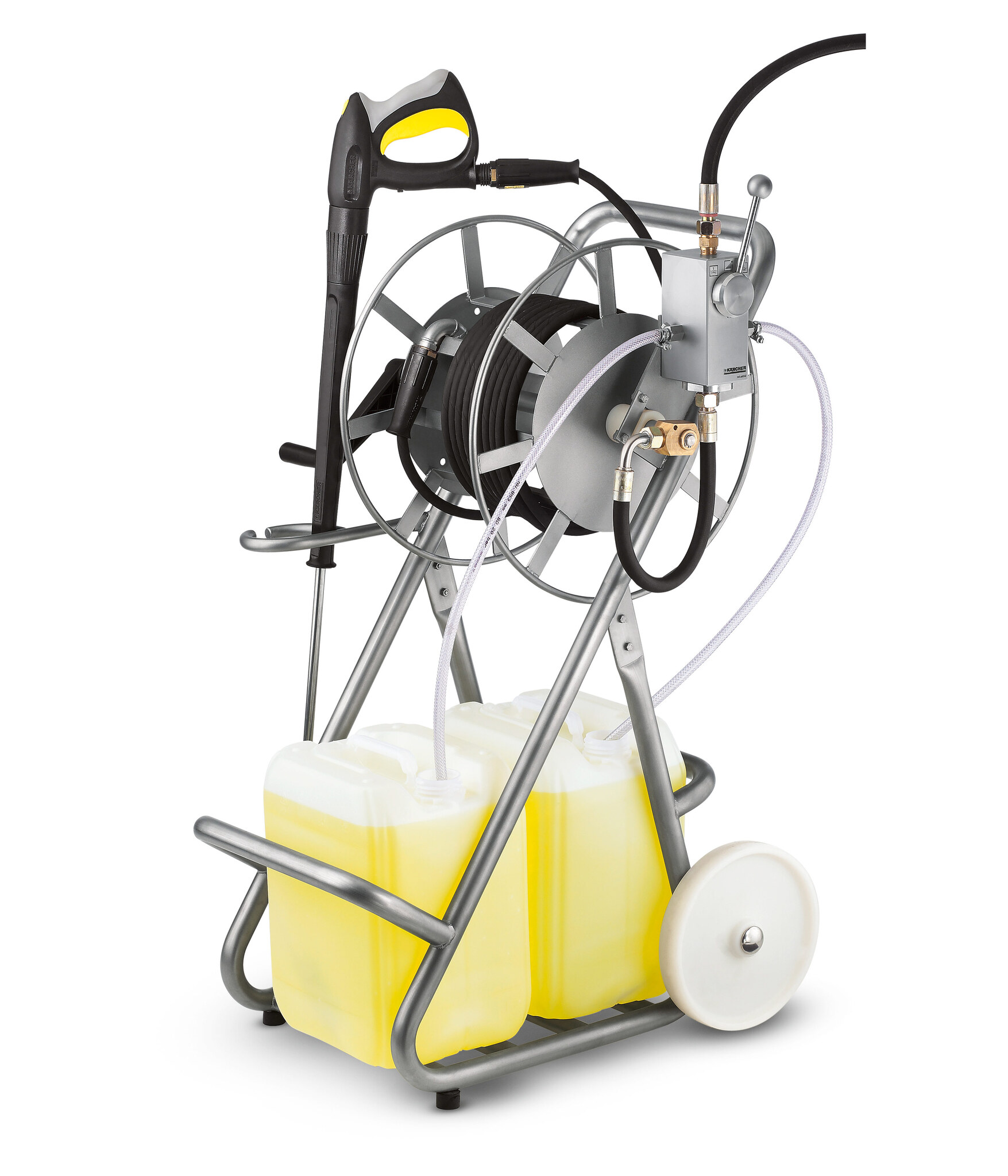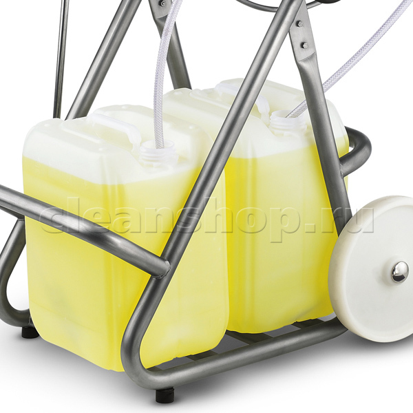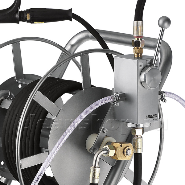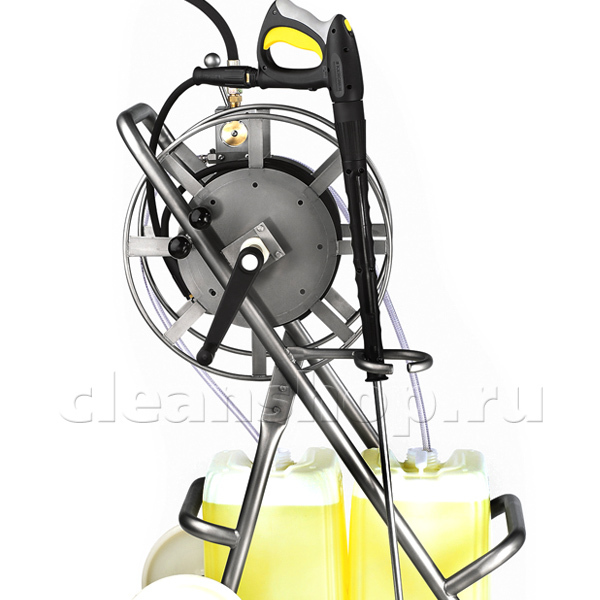 Мобильная система дозирования 2-х видов моющих средств работает при подключении к аппарату высокого давления. На барабан ставятся шланги (удлинительный и рабочий короткий) и пистолет с насадкой, далее - тележка подключается к выходу высокого давления аппарата и перемещается в нужное место работы, разматывая барабан. На месте оператор выбирает рукояткой инжектора один из трех режимов работы: высокое давление+химия 1/высокое давление+химия 2/просто высокое давление.