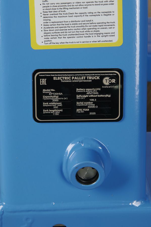 Тележка электрическая TOR EPT15H WB Li-pol с колесом баланса с грузоподъемностью 1500кг, вилами длиной 1150 мм оснащена дополнительным балансировочным колесом.