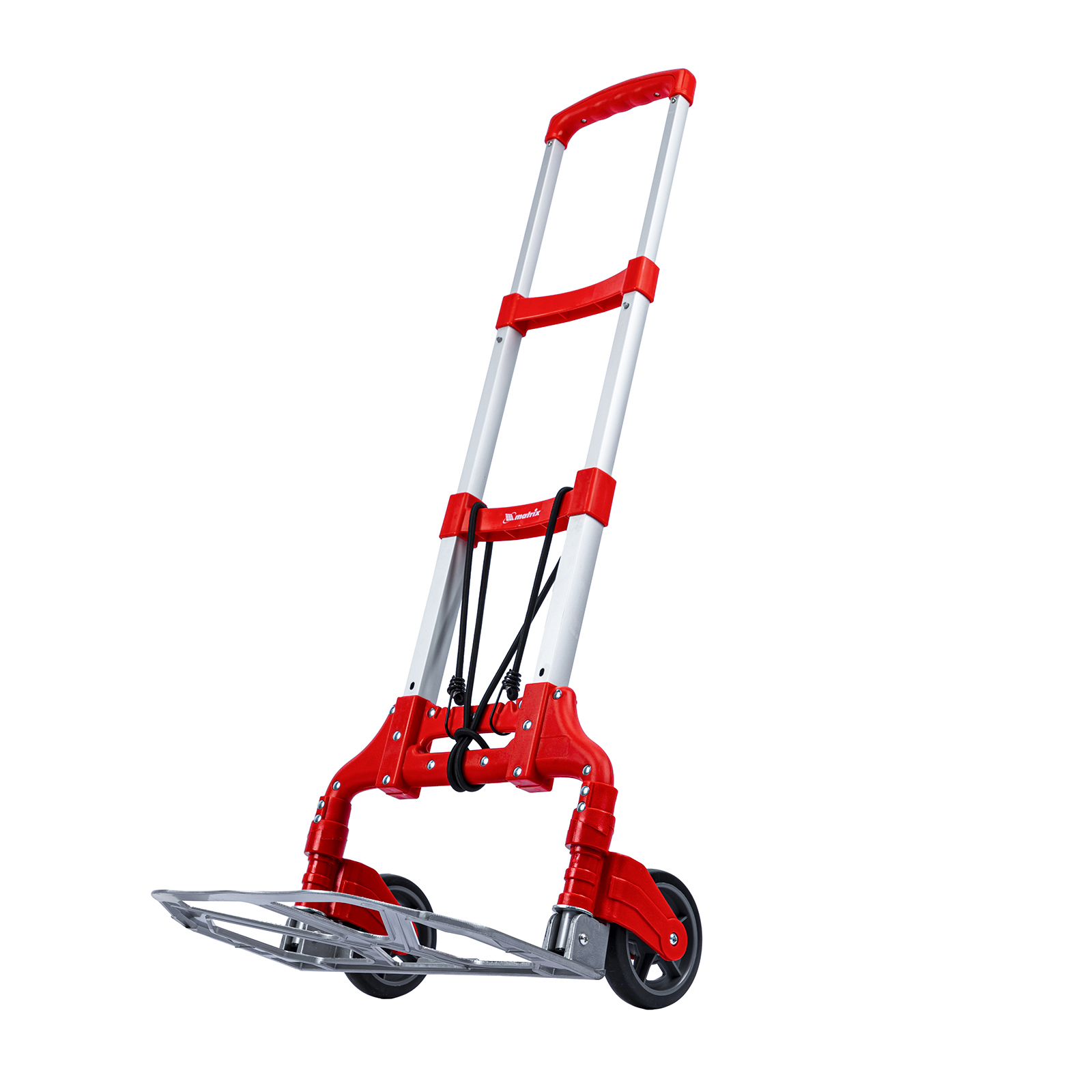 - Удобное хранение и транспортировка — платформа и колеса складываются, поэтому тележка не занимает много места.