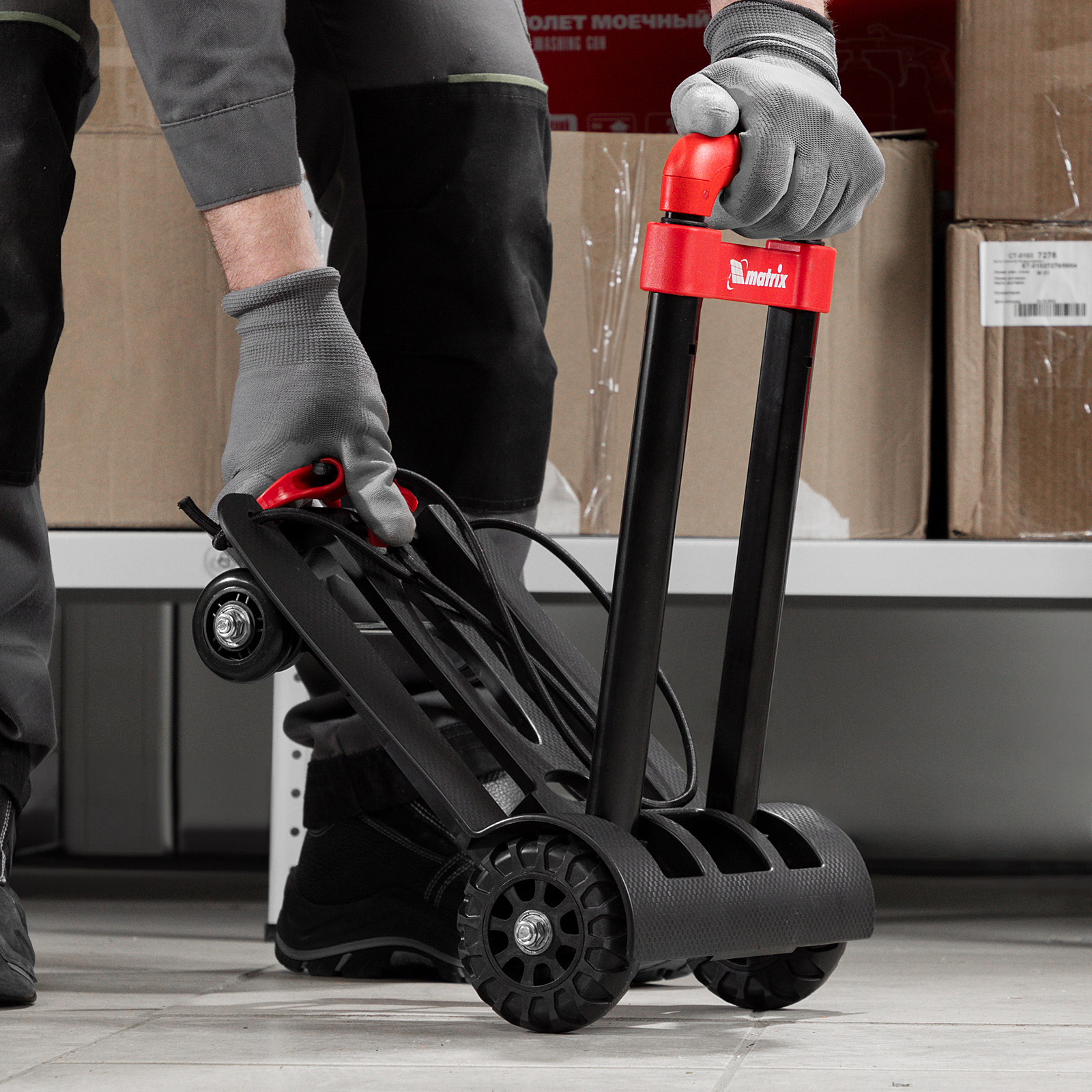 Складная хозяйственная 4-колесная тележка Matrix 98205 предназначена для перемещения грузов массой до 40 кг. Телескопическая рукоятка позволяет регулировать высоту тележки в соответствии с ростом пользователя. Для размещения груза предусмотрена платформа размером 230 x 250 мм.