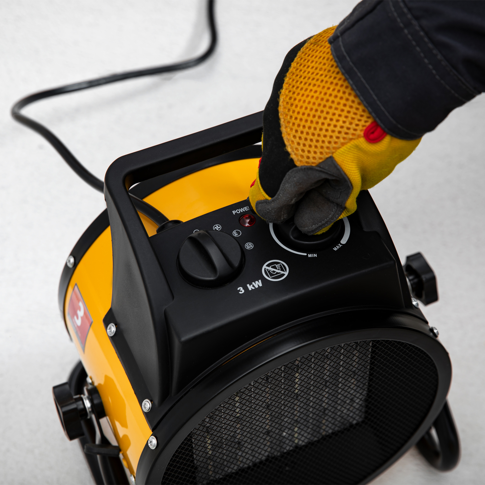 - Простое управление — при включении тепловой пушки загорается световой индикатор, а для переключения режимов и установки температуры служат два механических тумблера.