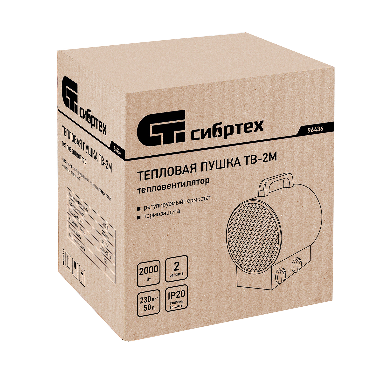 Тепловая пушка (тепловентилятор) Сибртех ТВ-2М 96436 питается от сети 230 В и работает 2 режимах: вентилятор и нагрев на мощности 2000 Вт. В короткие сроки прогревает даже неотапливаемые помещения: бытовые, производственные, подсобные и т.д. В цилиндрический корпус встроен круглый ТЭН, который обеспечивает эффективный теплообмен и практически мгновенно выходит на заданную температуру. Благодаря цилиндрической форме тепловентилятор формирует направленный поток воздуха. Подходит для помещений площадью до 20 кв. м, а также точечного прогрева поверхностей.
