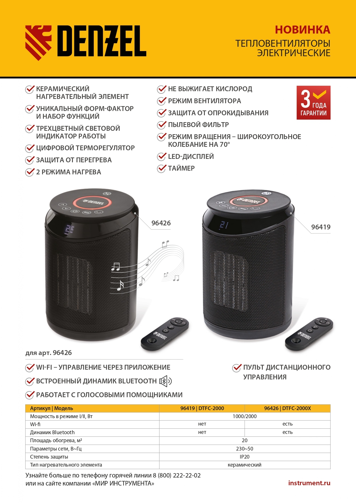 Тепловентилятор Denzel DTFC-2000X 96426 мощностью 2 кВт, с керамическим нагревательным элементом, пультом и динамиком, с функцией вращения и возможностью подключения по Wi-Fi, имеет 3 режима работы. Предназначен для обогрева и вентилирования бытовых помещений площадью до 20 м2. Позволяет поддерживать комфортный климатический режим в любое время года. Способен работать в режиме вентиляции, обогрева теплым (1000 Вт) и горячим воздухом (2000 Вт). В комплект поставки входит пульт дистанционного управления. Также можно подключить тепловентилятор к сети Интернет и управлять им из любой точки мира при помощи телефона или планшета с установленным приложением.