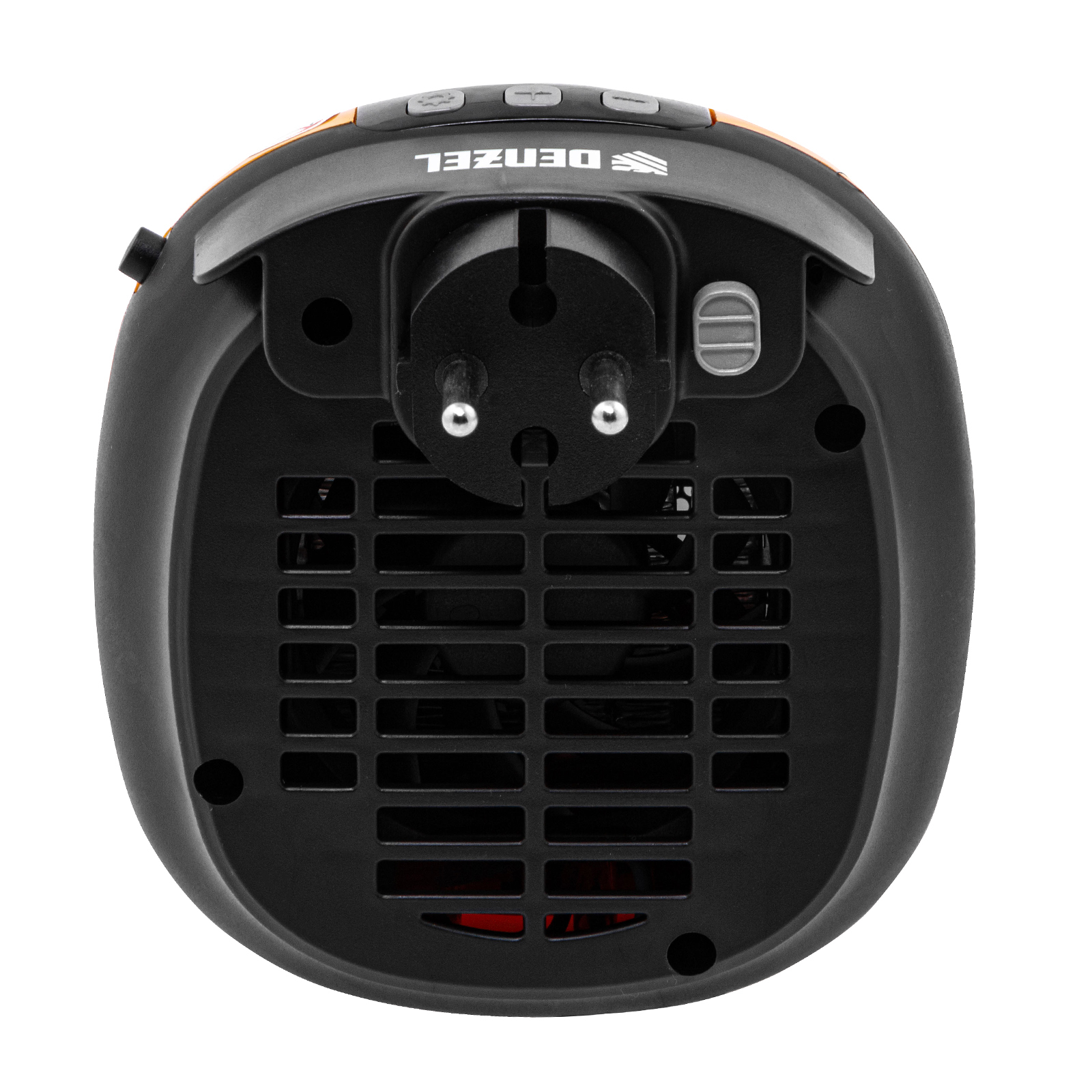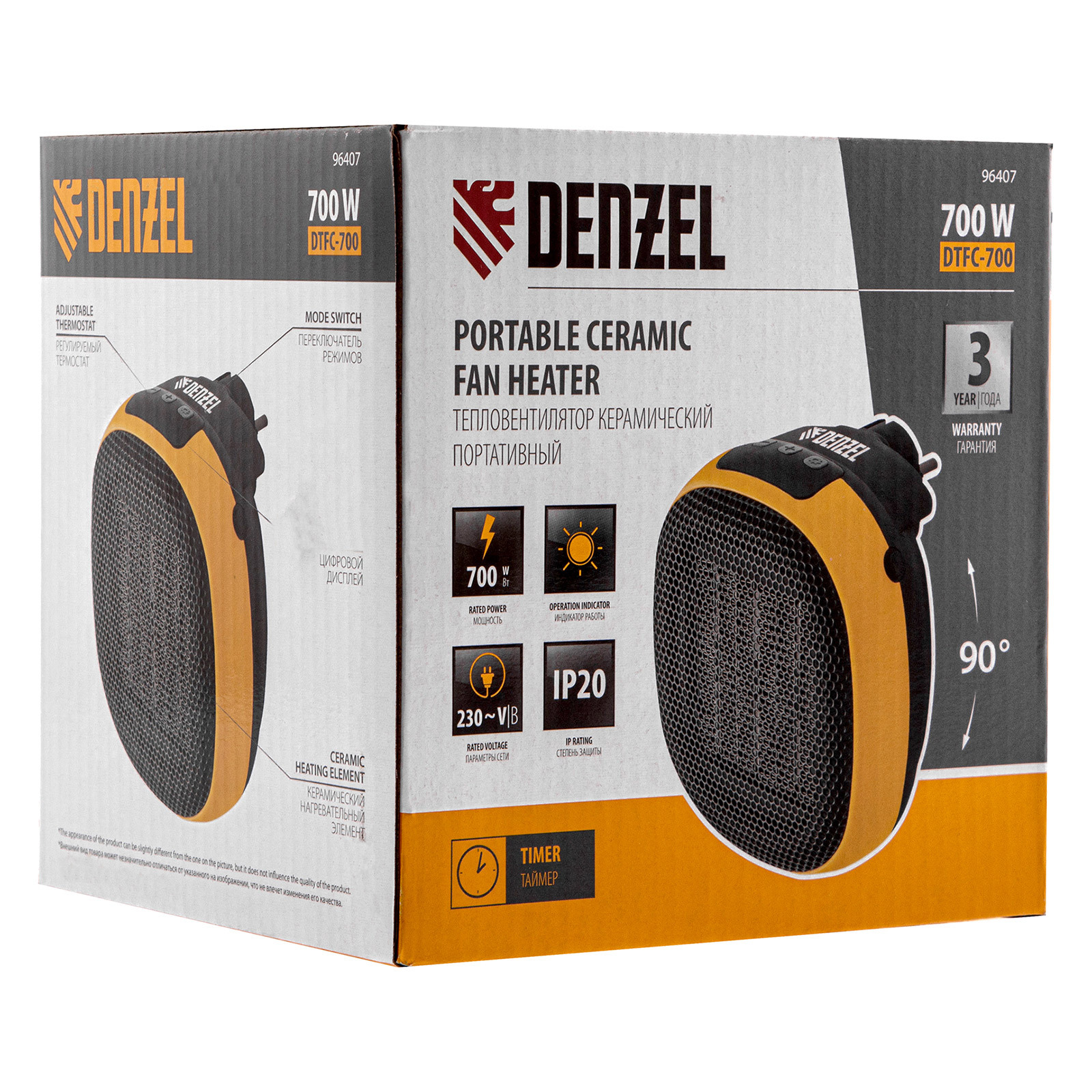 Портативный керамический тепловентилятор Denzel DTFC-700 96407 номинальной мощностью 700 Вт может работать в одном из двух режимов: нагрев с максимальной либо пониженной скоростью вентилятора (тихий режим). Используется в помещениях площадью до 10 кв. м., а также подходит для локального обогрева — например, рабочего места. Прост в эксплуатации и не требует технического обслуживания. Благодаря керамическому нагревательному элементу тепловентилятор не сушит воздух и не сжигает пыль, поэтому комфортен в использовании.