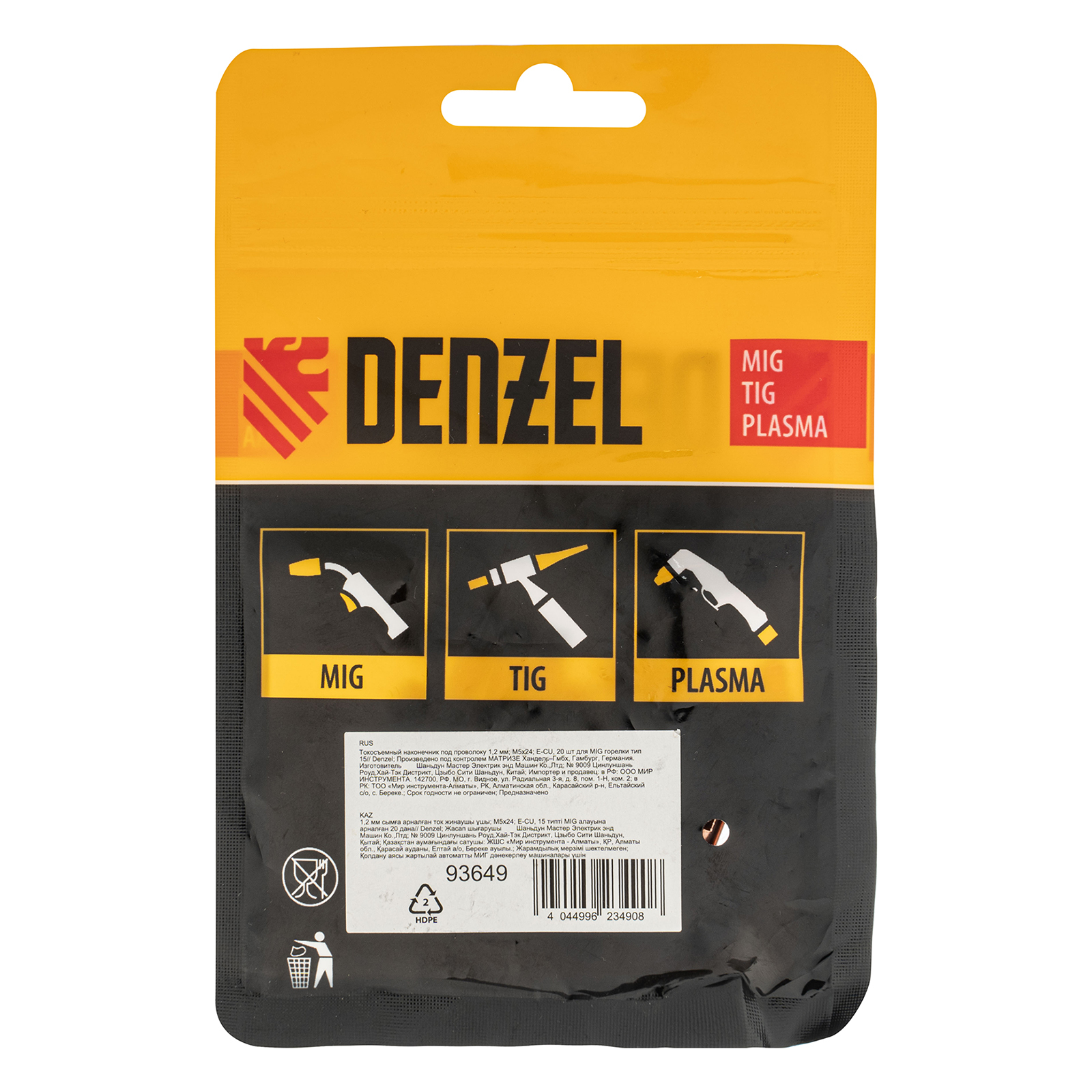 Токосъемный наконечник Denzel 93649 из меди E-CU, с резьбовым соединением M6х24, 20 шт. в упаковке, совместим со сварочными горелками типа 15 (в том числе с моделью Denzel 93641) и предназначен для подвода тока к проволоке диаметром 1,2 мм на выходе в область сварки. Используется для замены изношенной детали и позволяет быстро восстановить работоспособность горелки.