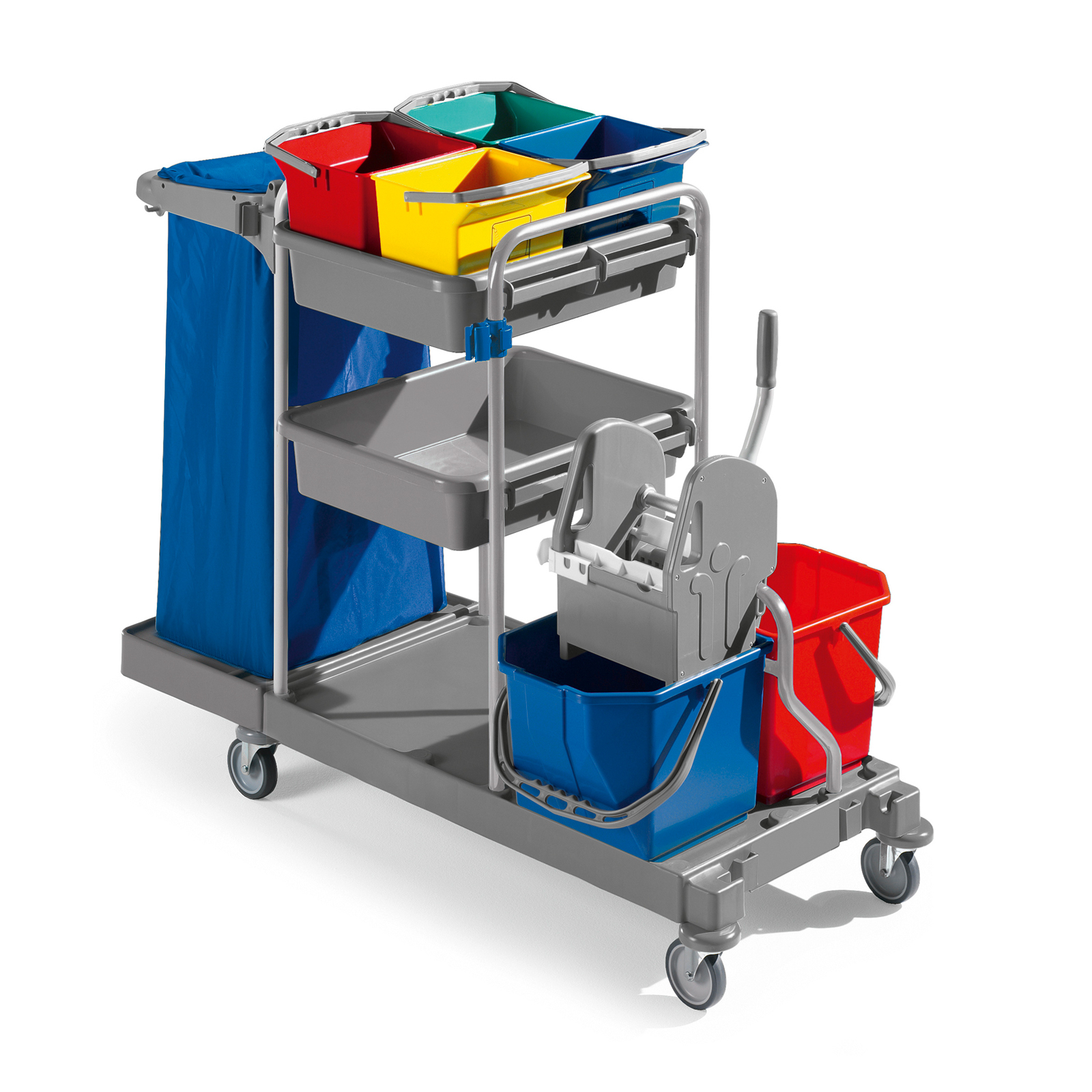 Вместительная тележка, конструктивно рассчитанная на большой мусоросборник для отходов, подходит для ежедневной уборки. Четыре вращающихся ролика обеспечивают удобство в обращении, а окрашенная стальная рама гарантирует долгий срок службы.