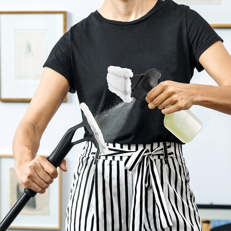 Мойка происходит в два этапа: с помощью закрепленной на удлинительной ручке насадки с обтяжкой из микрофибры, смоченной в моющем растворе, или вибрационного очистителя KV 4 стекла очищаются от загрязнений. Угол наклона насадки легко регулируется с помощью шарнира. Далее - необходимо закрепить стеклоочиститель, с помощью которого собрать со стекол жидкость вместе с грязью.