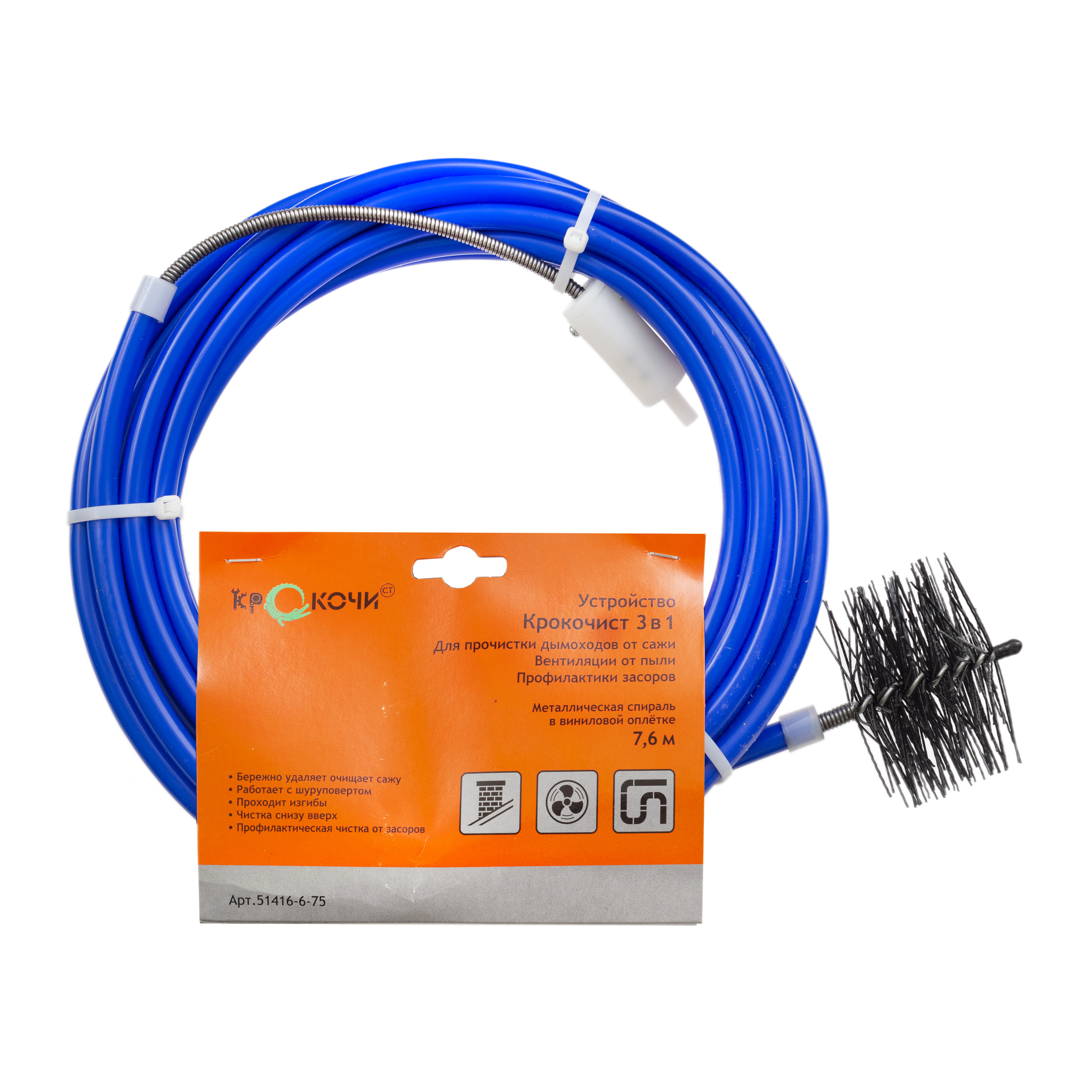 Устройство для дымоходов КРОКОЧИСТ 3 в 1, в виниловой оплетке 51416-6-75 предназначено для очистки дымоходов до 100 мм от сажи, вентиляционных каналов до 100 мм от пыли и профилактической прочистки канализации до 76 мм.