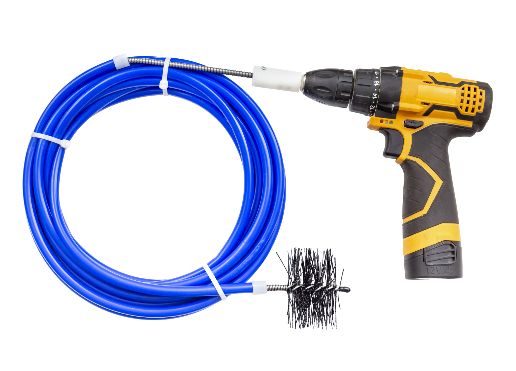 Устройство работает вместе с шуруповертом. Металлическая спираль в нейлоновой тубе соединена с одной стороны с муфтой проскальзывания для подключения к шуруповерту, с другой стороны нейлоновым ёршиком диаметром 76 мм.