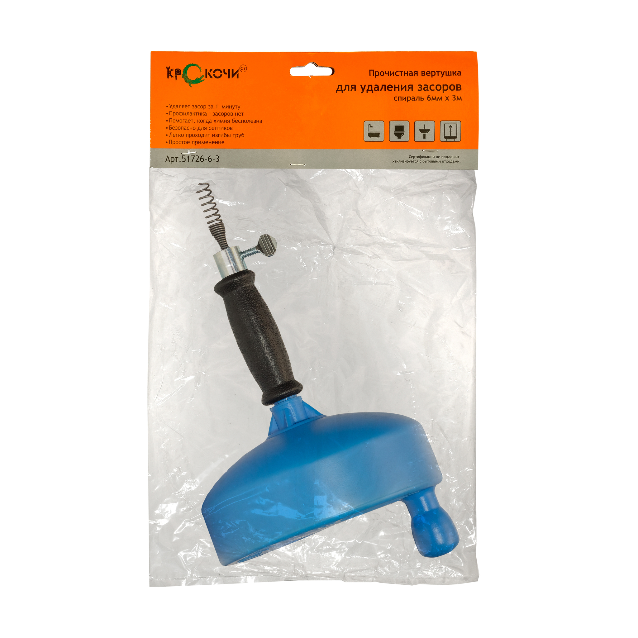 Прочистная вертушка - самый эффективный и универсальный инструмент для удаления засоров. Спираль смотана в барабане. Удобно хранить. Удобно работать.Удалить засор в трубе можно за минуты. Спираль извлекается на нужную длину, то очень удобно во время удаления засора. Хранение спирали в барабане позволяет производить прочистку труб в чистоте, а после прочистки хранить спираль без запахов и в компактном виде. Прочистные вертушки Крокочист отличает повышенное качество всех узлов: металлический зажим спирали, барабан из высококачественного нейлона, спираль выполенна из высокоуглеродистой пружинной проволоки. Модель для санузлов с типовой планировкой.