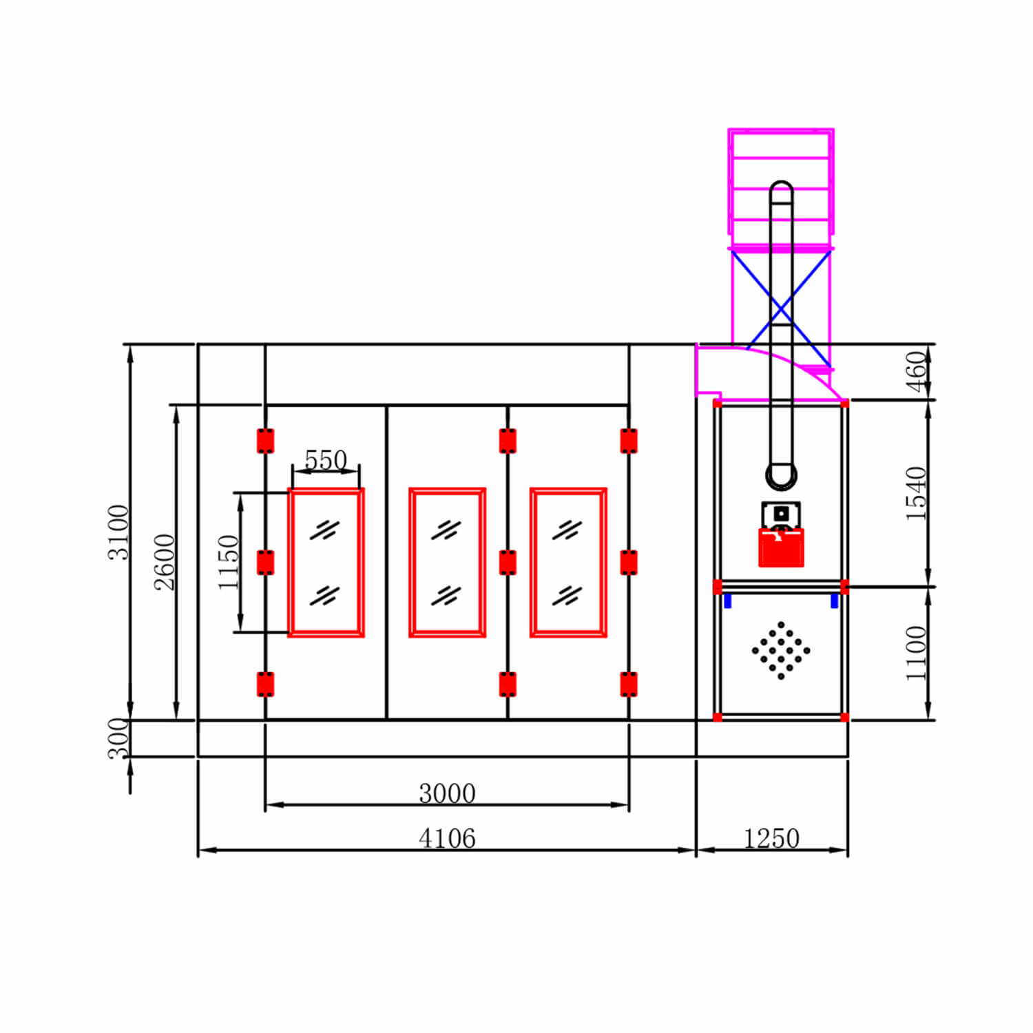 Унифицированная конструкция камеры позволяет установить дополнительный комплект ворот для организации сквозного проезда и, в процессе монтажа, расположить приточно-вытяжную группу с любой стороны.