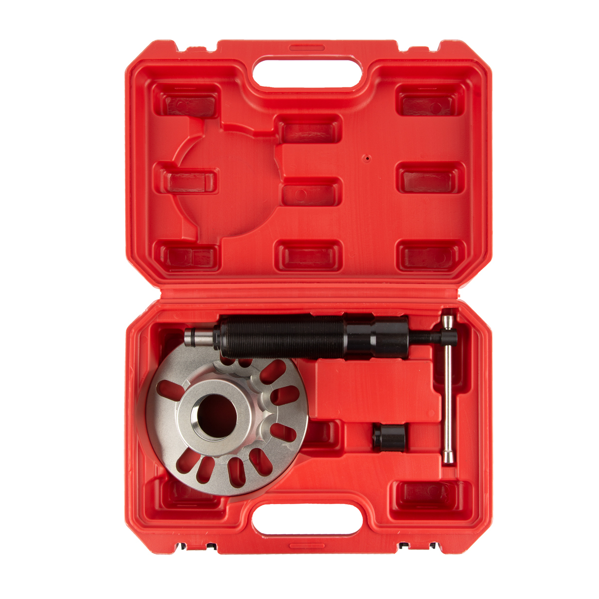 Гидравлический съемник ступицы колеса уменьшает усилия автомеханика при снятии опор за счет давления в системе. Используется для выпрессовки полуоси из ступицы. Подходит для 4- и 5-болтовых втулок, установленных по окружности диаметром 96–125 мм. Усилие 10 тонн.