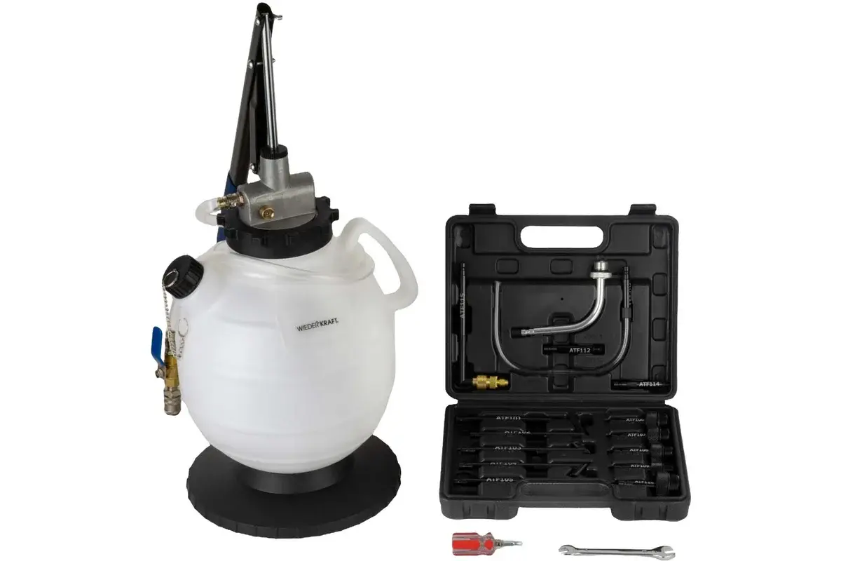 Набор для заправки масла в АКПП WiederKraft WDK-89092 применяется для замены или заправки ATF жидкости в АКПП, МКПП, редукторах, раздаточных коробках, гидроусилитель руля и т.д. различных автомобилей. Специальные адаптеры, входящие в комплект поставки и имеющие разную форму, дают возможность проводить процедуру в неудобных условиях.