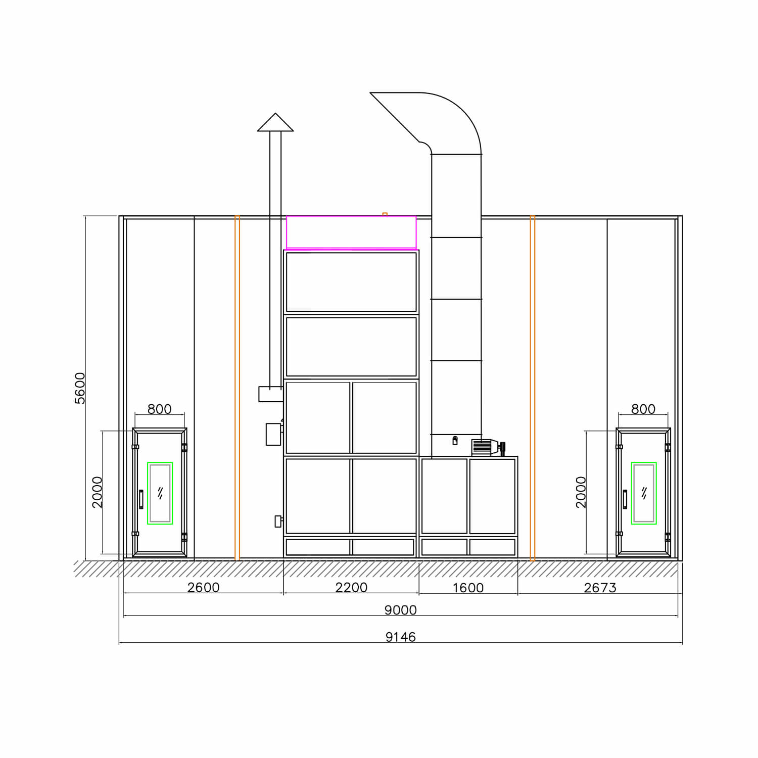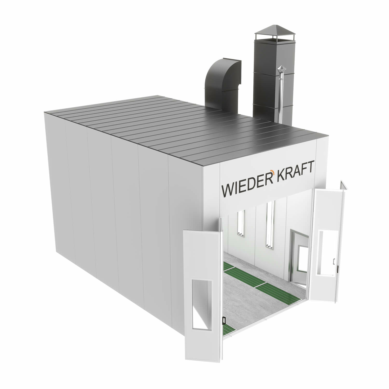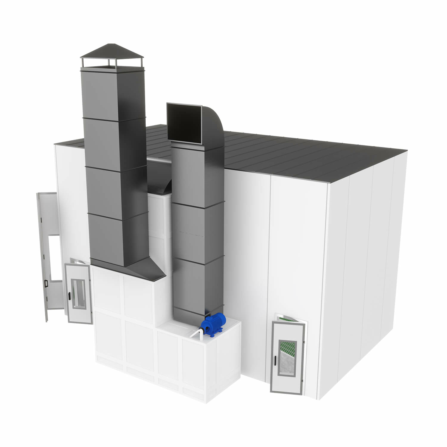Окрасочно-сушильная камера с дизельными горелками Riello и приточно-вытяжным тепловентиляционным агрегатом. Используется для сушки лакокрасочных покрытий и организации технологических процессов окраски. Боковые стены состоят из сэндвич-панелей (негорючий пенополистирол толщиной 70 мм) и являются теплоизоляционными. Визуальный контроль позволяют осуществить 3-х створчатые ворота со встроенными смотровыми окнами. Можно установить дополнительный комплект ворот с целью организации сквозного проезда. Установить приточно-вытяжную группу с любой стороны в процессе монтажа позволяет унифицированная конструкция.